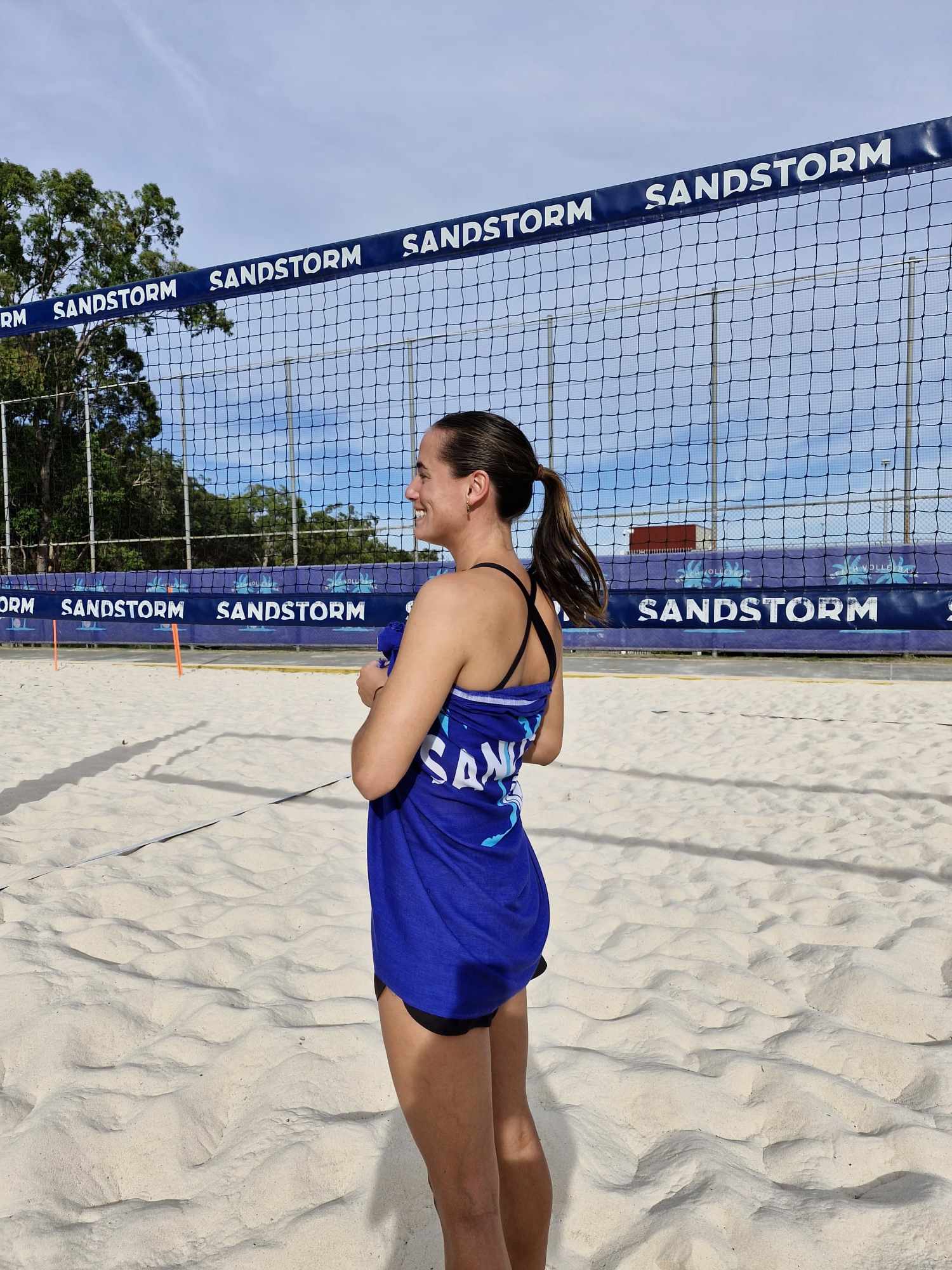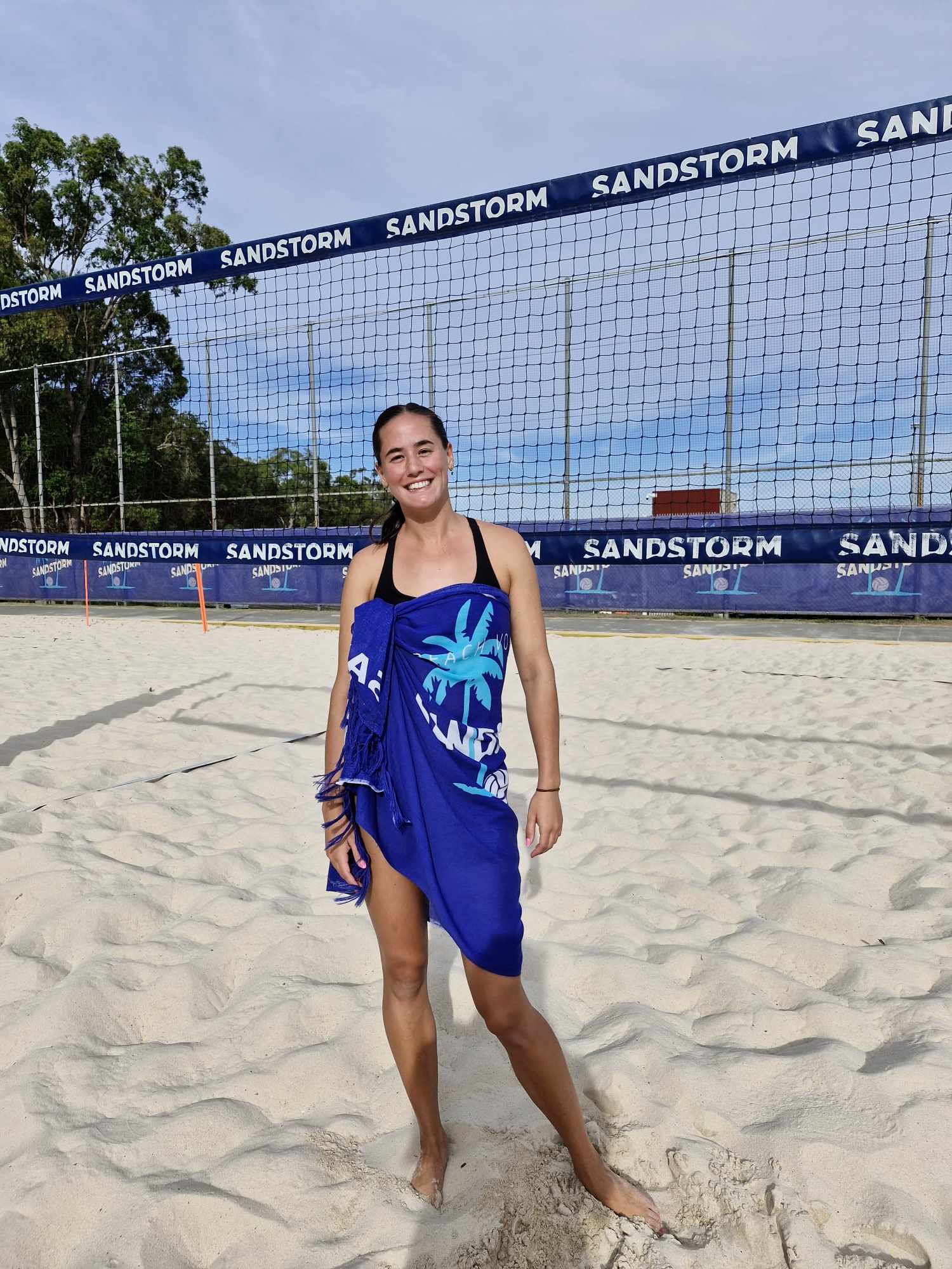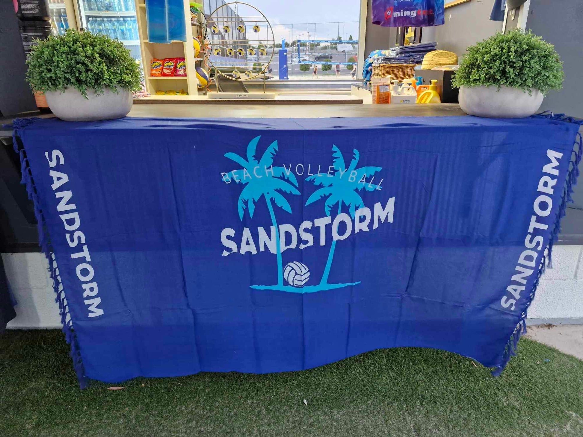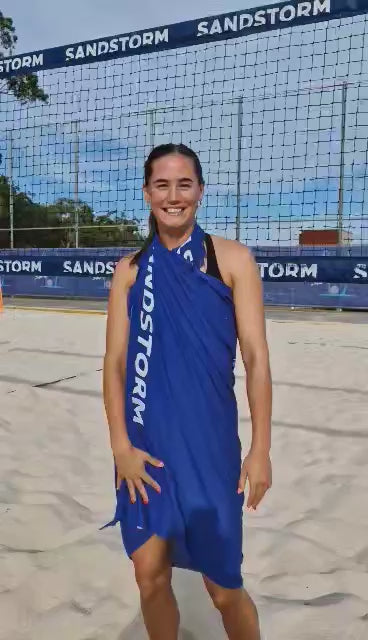 The Sandstorm Sarong is a stylish and versatile beach accessory made in Indonesia. Our sarong is hand-printed and crafted from high-quality rayon, a soft and lightweight fabric that is well-suited for warm weather. The design features our signature palm tree logo to represent Sandstorm Beach Volleyball in Brisbane.